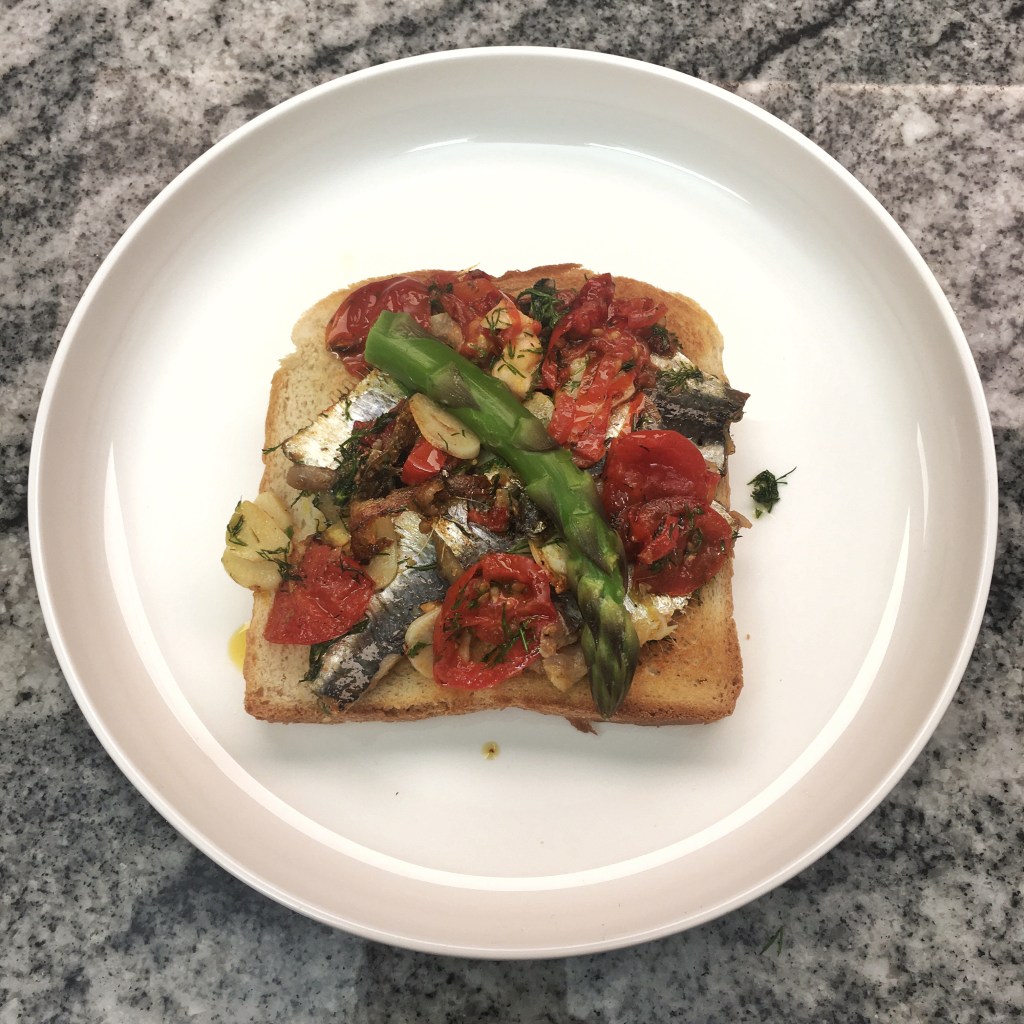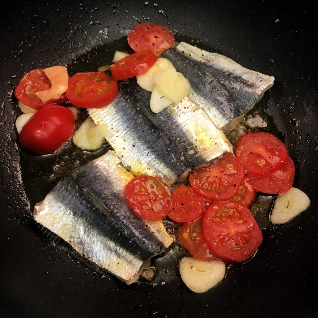 Ich hab sie mir heute knusprig gebraten, mit Knoblauch, dünn geschnittenen Kirschtomaten, einem Hauch Dille, Salz und Pfeffer. Mit den Sardinen muss man normal nichts mehr machen. Üblicherweise ist das Rückgrat bereits ausgelöst, die Gräten sind so fein und dünn, dass sie beim Essen nicht stören. Dennoch sollte man die Filets zuerst auf der Fleischseite braten, damit die Gräten quasi verkochen.